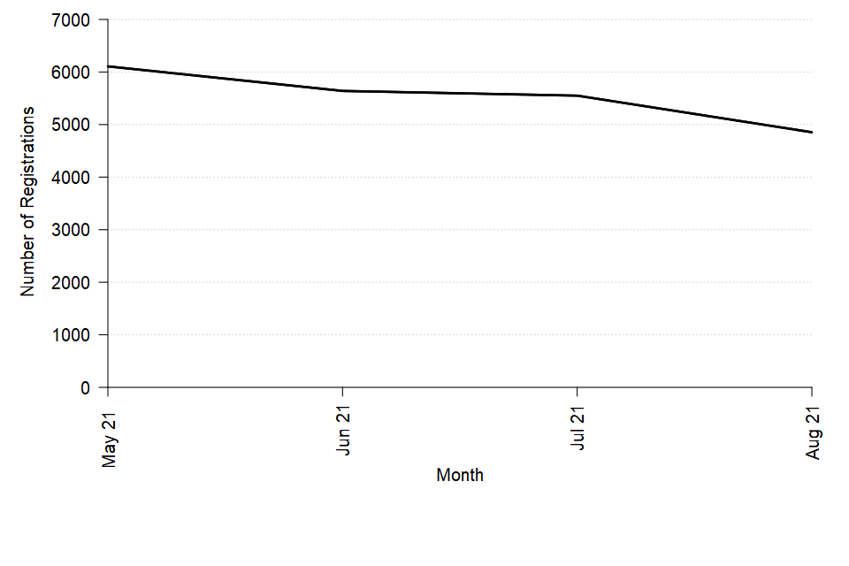 A line chart showing the change over time in the monthly number of Breathing Space registrations in England and Wales between May 2021 and August 2021. The data can be found in Table 7 of the accompanying tables. [Source: Insolvency Service]