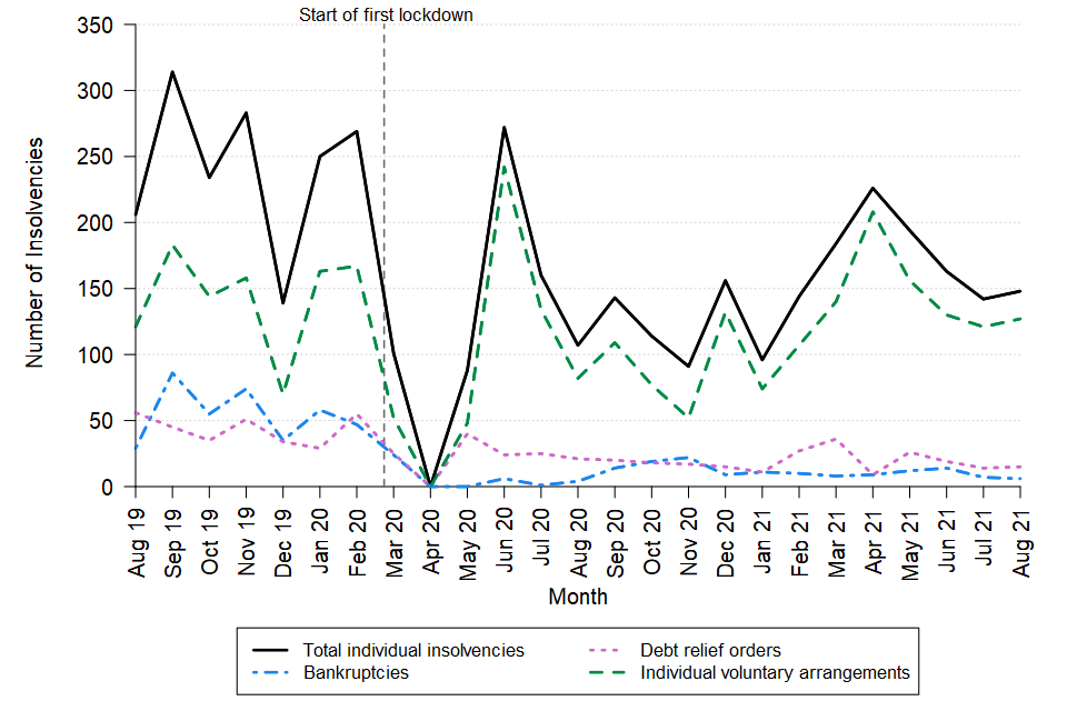 In August 2021 there were 148 individual insolvencies in Northern Ireland, 38% higher than August 2020 but 28% lower than August 2019. This consisted of 127 IVAs, 15 DROs and six bankruptcies.