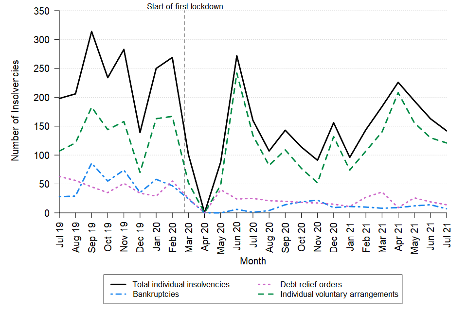 In July 2021 there were 142 individual insolvencies in Northern Ireland, 11% lower than July 2020 and 28% lower than July 2019. This consisted of 121 IVAs, 14 DROs and seven bankruptcies.