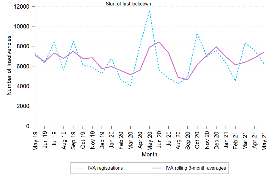 IVA registrations presented in Figure 3 are the numbers of registrations with the Insolvency Service in each month. The rolling three-month averages presented are mean average number of registered IVAs in the three months ending in the reference period. For example, the three-month rolling average estimate for May 2021 is the calculated mean average of the total IVA registrations during March, April, and May 2021.