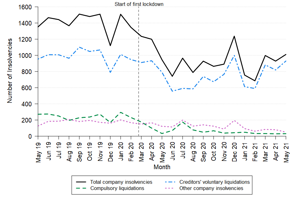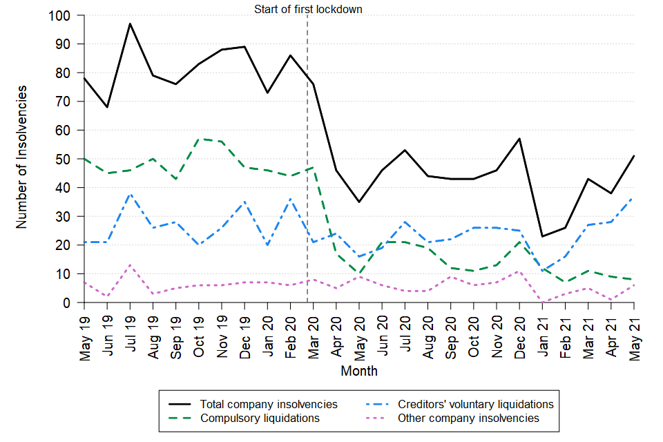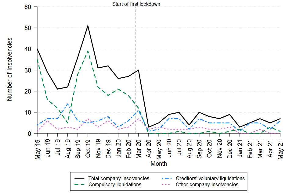 Since the start of the first UK lockdown, as a response to the coronavirus (COVID-19) pandemic in March 2020, overall numbers of company and individual insolvencies have remained low when compared with pre-pandemic levels. This is likely to be partly driven by government measures put in place to support businesses and individuals during the pandemic, including: