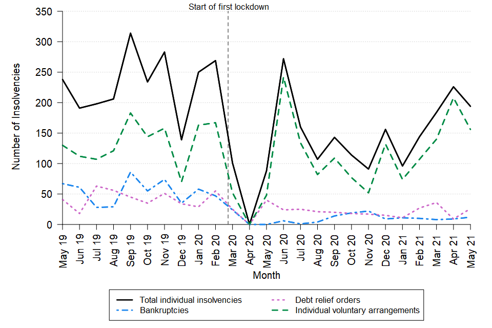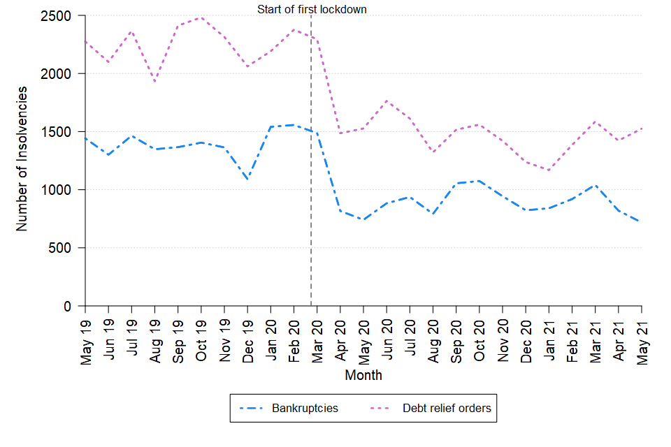 A line chart showing the change over time in the monthly number of bankruptcies and debt relief orders in England and Wales between May 2019 and May 2021. The data can be found in Table 3 of the accompanying tables. [Source: Insolvency Service]