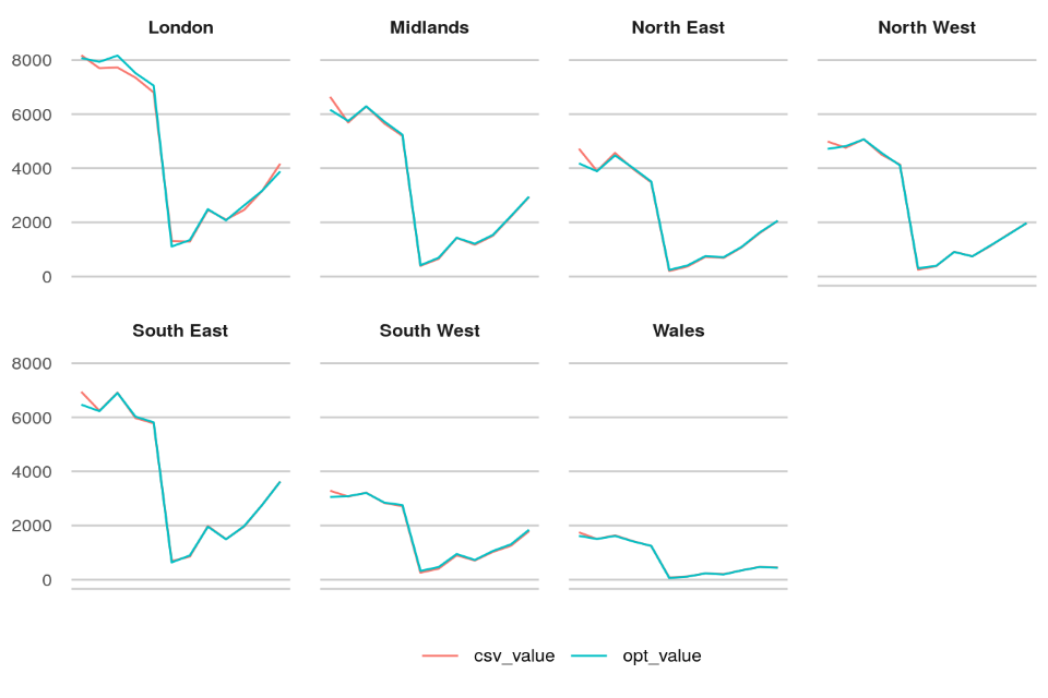 Automated quality checks using R scripts are embedded in the publication process to produce trends and highlight any anomalies in the data. Summary data provided from the various sources is compared against previous returns to check quarter on quarter, regional and national level comparisons. The below charts show examples of checks completed on the data.