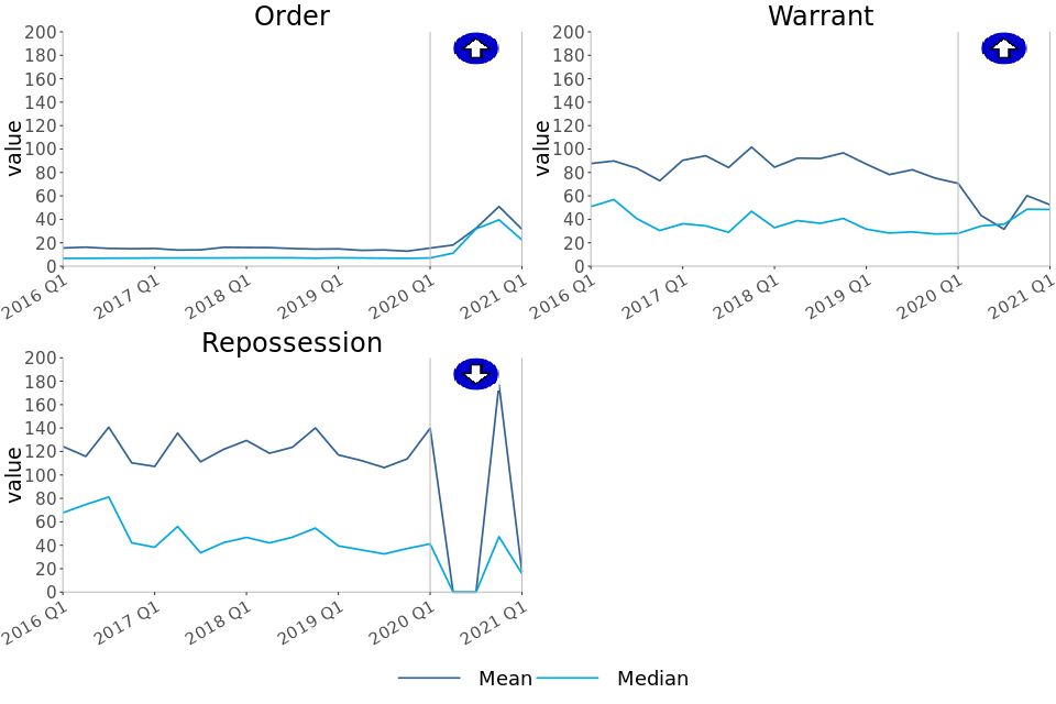 The short-term increases noted over the past few quarters reflect the stay on most possession claims implemented between March and September 2020 for case progression and the ongoing stay to evictions (with some exceptions). Those cases that are able to progress to repossession therefore include the duration of the stay within their timeliness. This “hold stay period” will form part of many possession actions over the next few quarters.