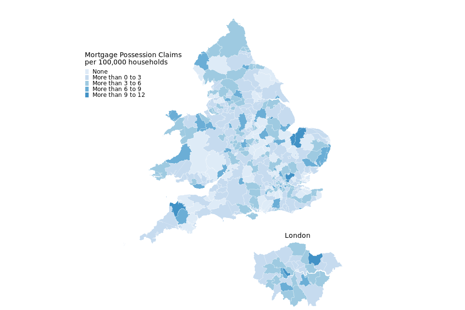 | Mortgage and Landlord possession claims, and repossession rates have fallen across all regions | Decreases in possession claims have been recorded over all regions. Landlord claims remain concentrated in London (with 9 of the highest 10 claim rates). |