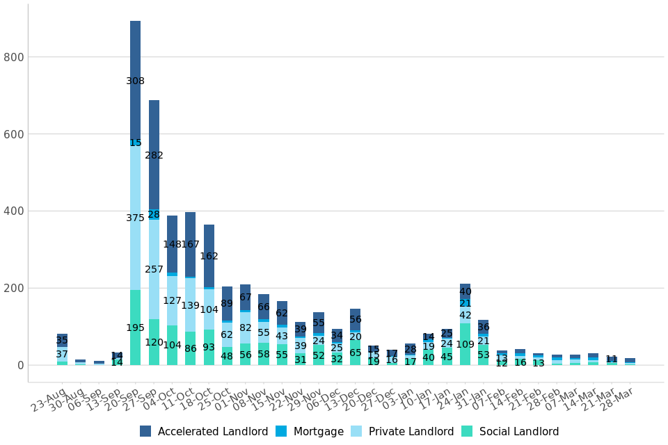 Though the proportions of landlord types have remained fairly consistent throughout this period, after December, accelerated landlord repossessions remained considerably low. As a result, private and social landlord repossessions made up the bulk, with only 3% accelerated landlord repossessions in March.