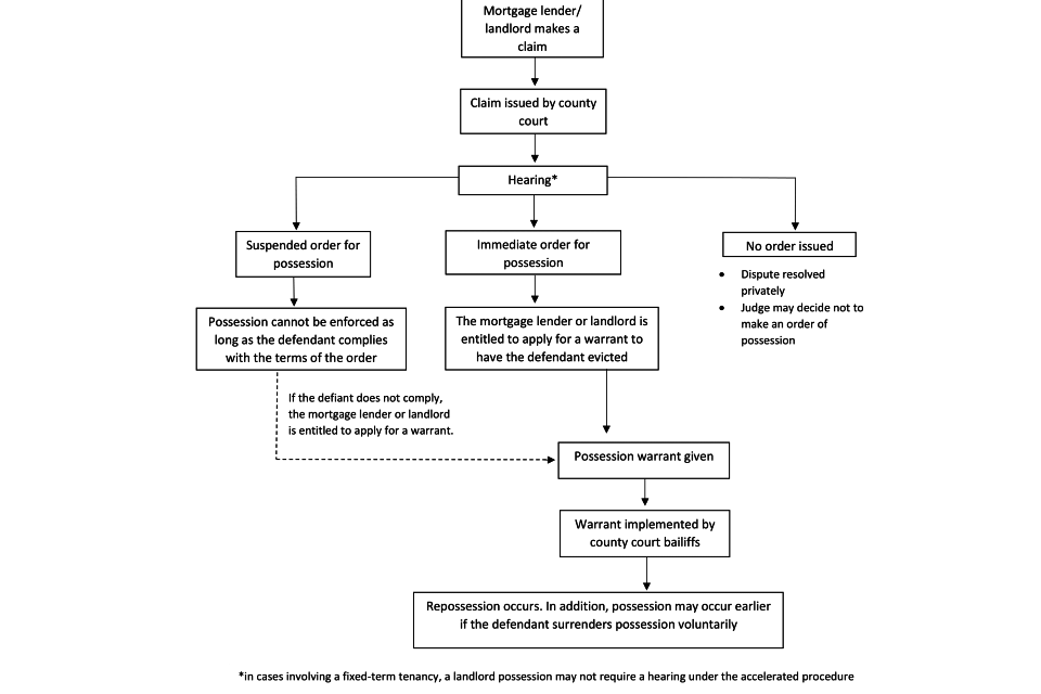 To obtain a court order granting the entitlement to take possession of a property, a claimant – a mortgage lender or a landlord – must first make a claim for possession of property which is then issued by a county court. Generally, the issuing process involves the arrangement of an initial hearing before a judge. At such a hearing, a judge may: