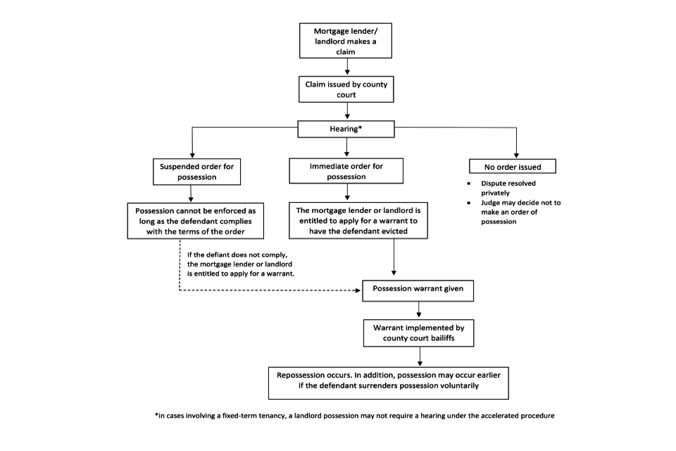 To obtain a court order granting the entitlement to take possession of a property, a claimant – a mortgage lender or a landlord – must first make a claim for possession of property which is then issued by a county court. Generally, the issuing process involves the arrangement of an initial hearing before a judge. At such a hearing, a judge may: