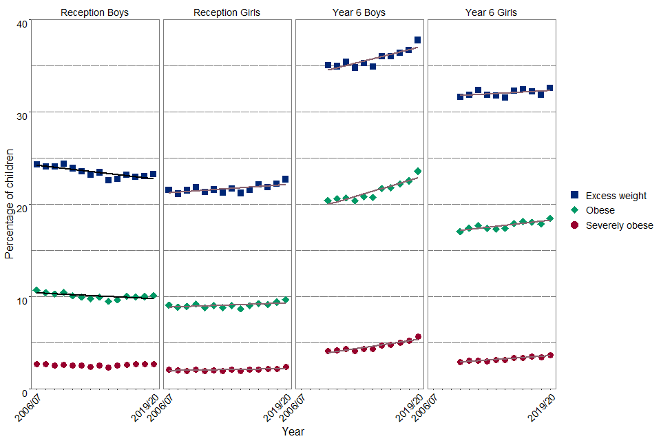 - reception girls and year 6 boys and girls had an upward trend in the prevalence of obesity, excess weight and severe obesity, which was driven by increases for pupils from the more deprived areas, offsetting any decreases seen for pupils from the least deprived areas