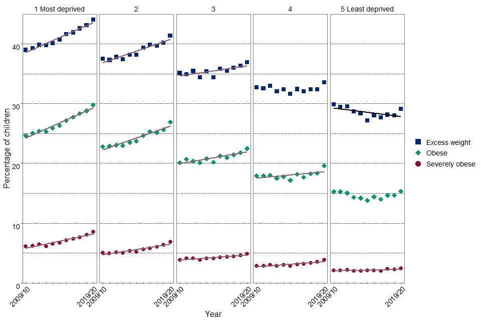 - prevalence of obesity was increasing across all but the least deprived quintile, and prevalence of excess weight was increasing across quintiles 1 to 3 with the most deprived quintile (1) showing the steepest increases