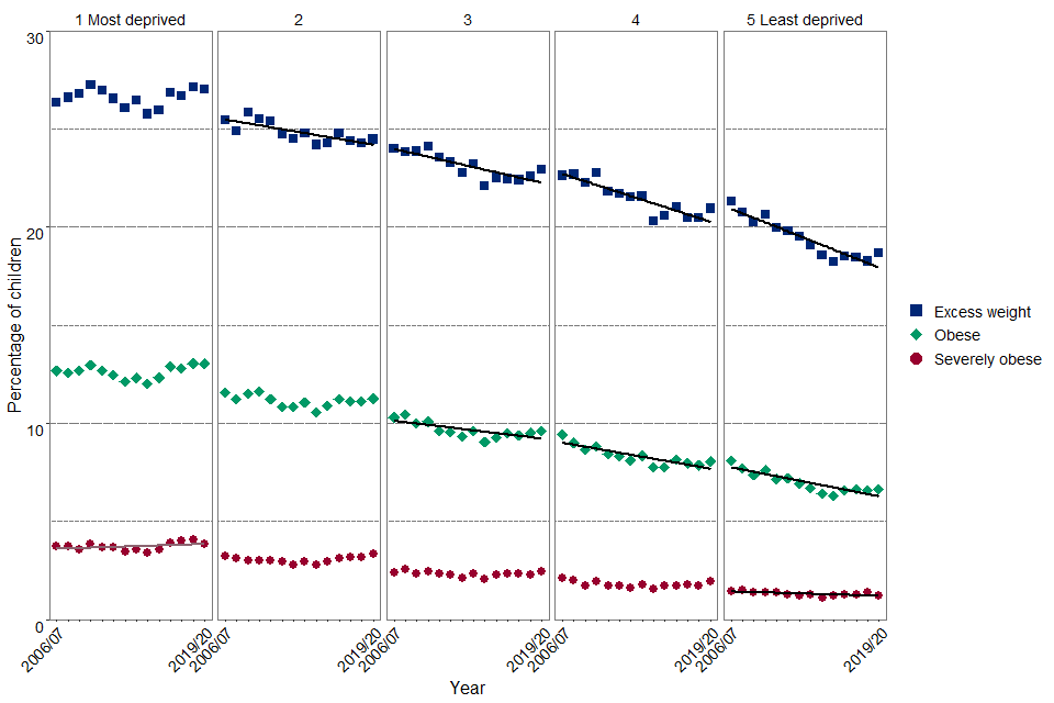 - there was a downward trend in the prevalence of obesity and excess weight in the least deprived quintile, and prevalence of excess weight in quintile 4