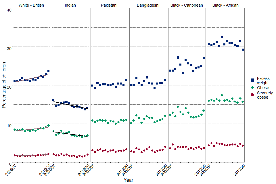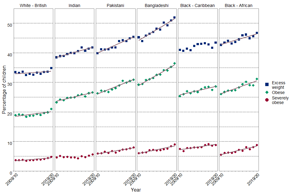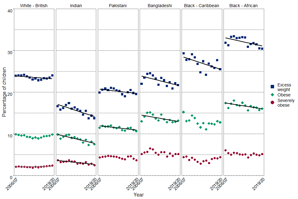 - there was a downward trend for excess weight in White British girls, but an upward trend for obesity and severe obesity