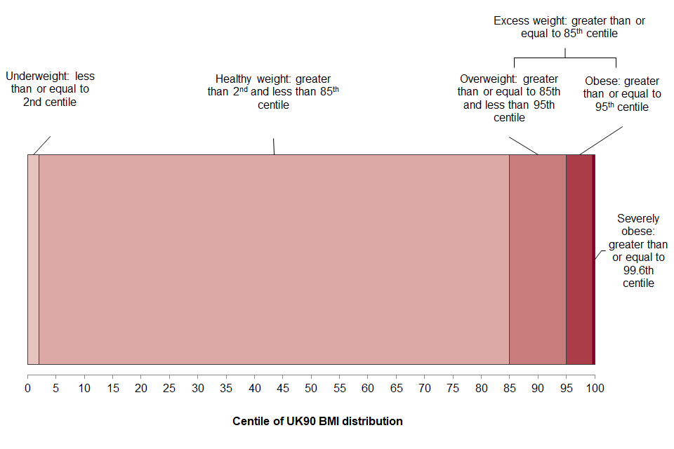 Assessing the BMI of children is more complicated than for adults because a child’s BMI changes as they mature. Growth patterns differ between boys and girls, so both the age and sex of a child needs to be considered when estimating whether BMI is too high or too low. In England the British 1990 growth reference (UK90)[footnote 1] for BMI is recommended for use to determine weight status according to a child’s age and sex. Each child’s BMI is calculated and compared with the BMI distribution for children of their age and sex from the UK90 growth reference. For population monitoring purposes BMI is classified according to the following table using the UK90.
