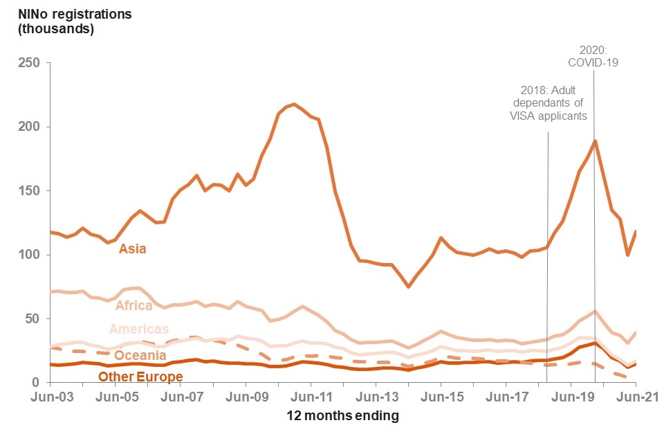 This summary contains statistics on National Insurance numbers (NINos) allocated to adult overseas nationals, covering the period from January 2002 to June 2021.