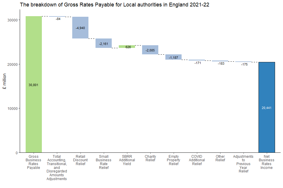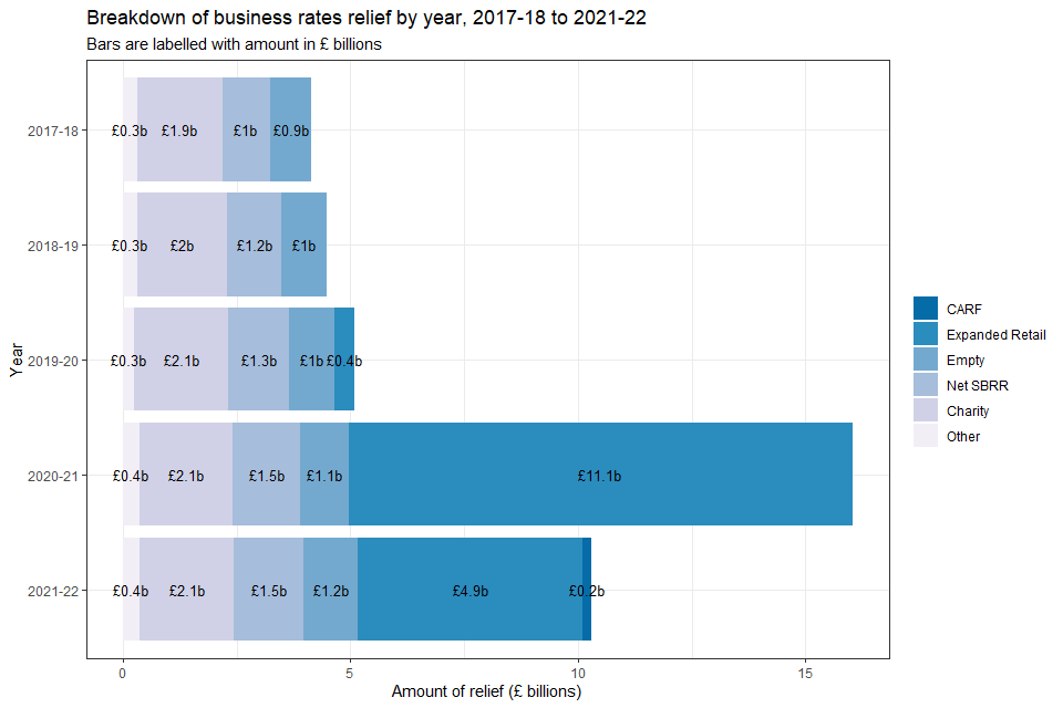 - Local authorities reported that they granted a total of £10.3 billion of relief from business rates in 2021-22. Of this £1.6 billion is the net cost of small business rate relief, £3.4 billion is the cost of other mandatory relief and £5.3 billion is the cost of discretionary relief, of which £4.9 billion was the expanded retail discount relief.