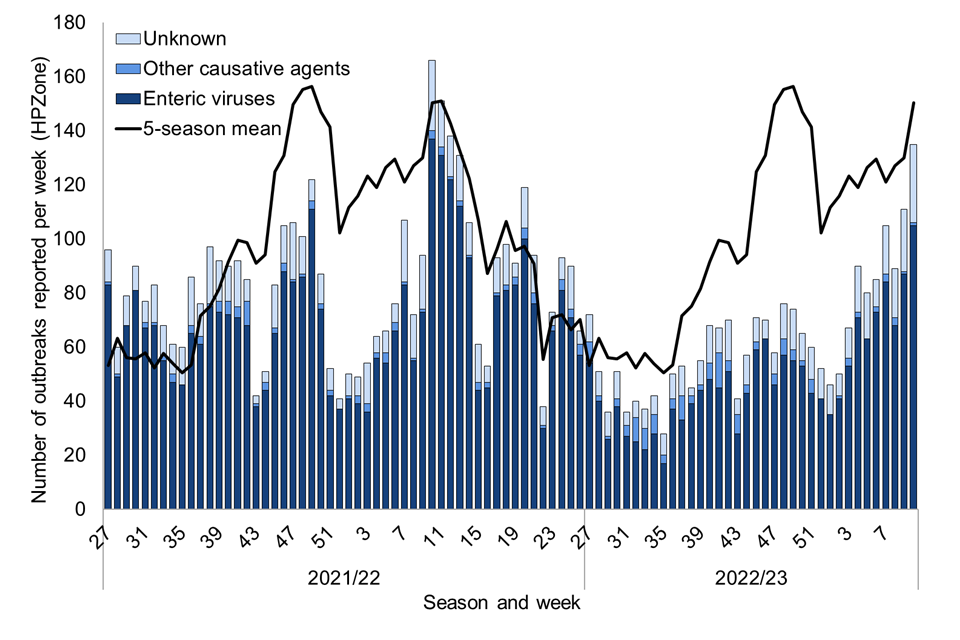 Reported EV outbreaks have shown indications of increasing in recent weeks. However, up to week 10 of the 2022/2023 season the cumulative number of EV outbreaks reported to HPZone was 42% lower than the pre-pandemic 5-season average (2014/2015 to 2018/2019), 1,742 and 3,025 outbreaks respectively (Figure 3).