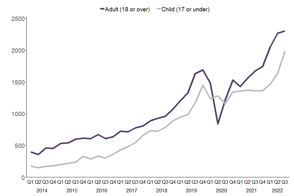 - 4,586 potential victims of modern slavery were referred to the Home Office in quarter 3 2022, representing a 10% increase compared to the preceding quarter (4,169) and a 38% increase from quarter 3 2021 (3,317)