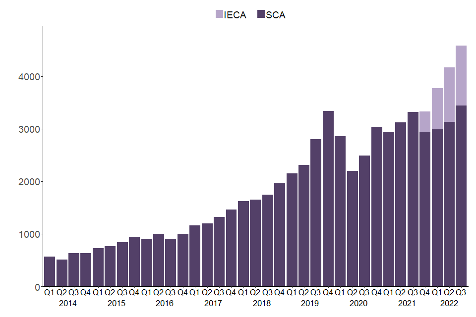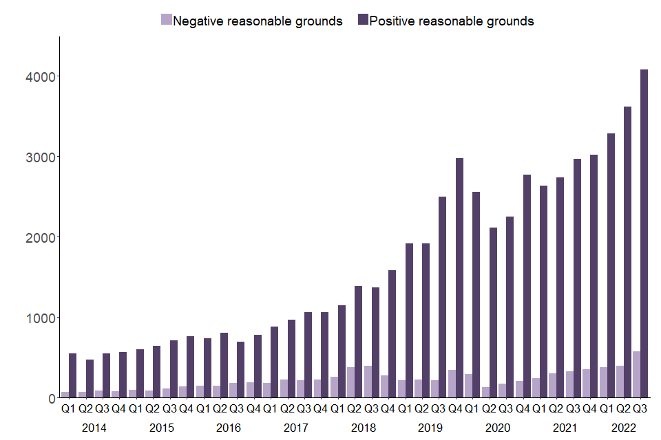 In quarter 3 2022, 4,652 reasonable grounds decisions were issued. This was the highest quarterly number issued since the NRM began. Of these, the SCA issued 3,497 and the IECA issued 1,155; 87% (3,032) of decisions made by the SCA were positive compared to 91% (1,048) of decisions made by the IECA (data tables 16 and 17).