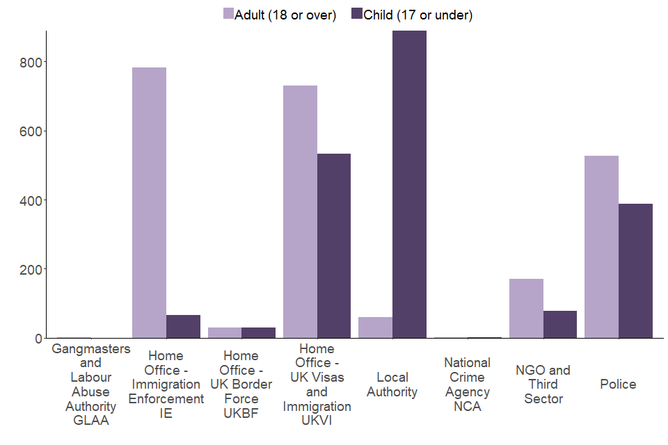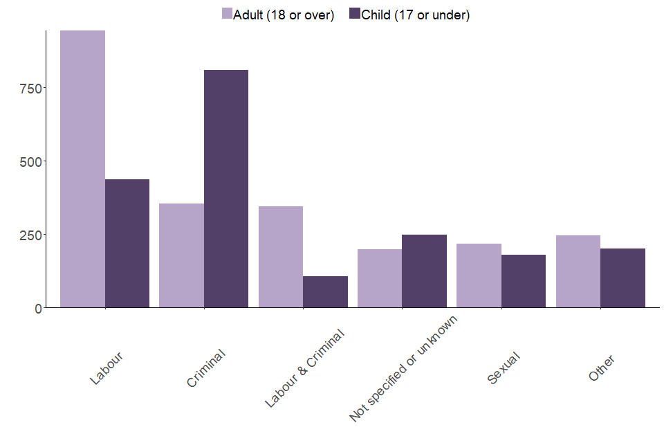 - adult potential victims most commonly claimed labour exploitation (41%; 943), whereas child potential victims were most often referred for criminal exploitation (41%; 808)