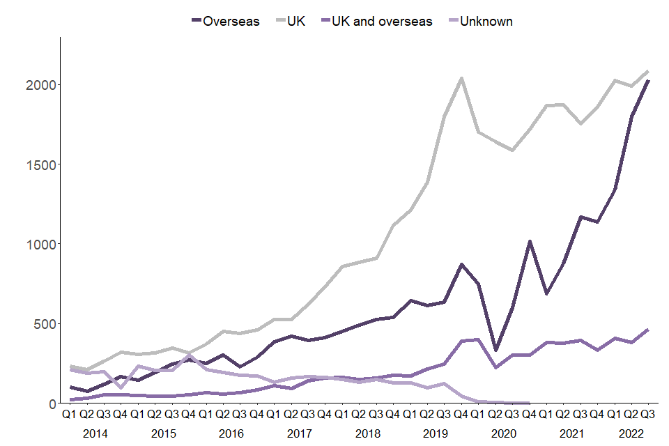 Overall, 46% (2,088) of potential victims claimed exploitation in the UK only, compared to 48% (1,989) in quarter 2 2022, and 44% (2,032) claimed exploitation overseas only, compared to 43% (1,798) in quarter 2 2022 (data table 2; Figure 3). Following a substantial decrease in quarter 1 2021, referrals for those claiming exploitation overseas only have reached both their highest number and proportion. Referrals for potential victims claiming UK exploitation only have reached their highest number since the NRM began.