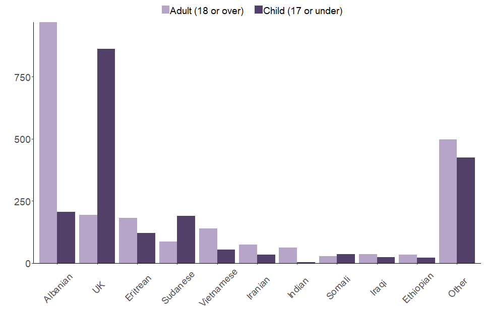 Please note, a change to data recording from 1 October 2019 means that NRM data reflects the dual nationality of potential victims in separate categories. To see total counts of a particular nationality, please refer to the data tables. A potential victim’s nationality is based on information provided by the first responder upon referral; however case workers may update this as further information is gathered.