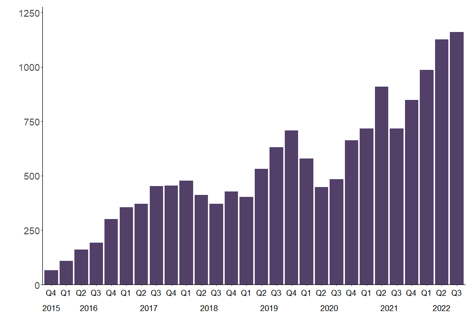 In quarter 3 2022, the NRM received 4,586 referrals of potential victims of modern slavery. This represents a 10% increase in referrals compared to the preceding quarter (4,169) and a 38% increase from quarter 3 in 2021 (3,317). This quarter saw the highest number of quarterly referrals since the NRM began.