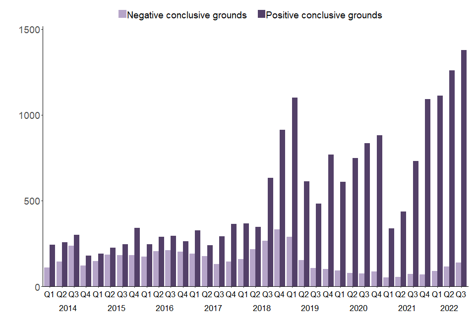 In quarter 3 2022, 1,517 conclusive grounds decisions were issued, compared to 1,375 in quarter 2 2022 and 803 in quarter 3 2021. The number of conclusive grounds decisions issued this quarter is the highest since the NRM began, following the increasing trend since the early months of 2021 due to the recruitment of additional decision makers by the competent authorities. For decisions issued this quarter, the proportion of positive conclusive grounds decisions was 89% for adult and 94% for child potential victims (data table 18).