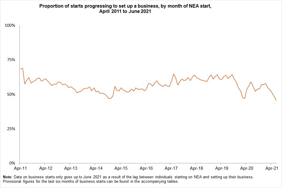 Since April 2011, a total of 276,000 individuals have started on the programme and up to June 2021, 157,000 individuals (57%), have progressed to set up a business.