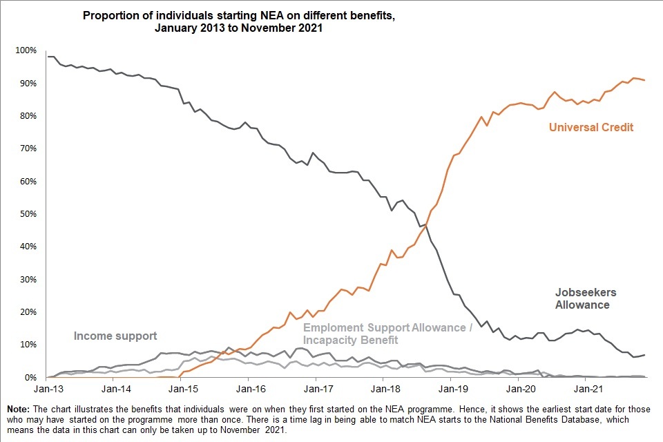 - in December 2021, around 92% of those starting NEA were claiming Universal Credit (UC)