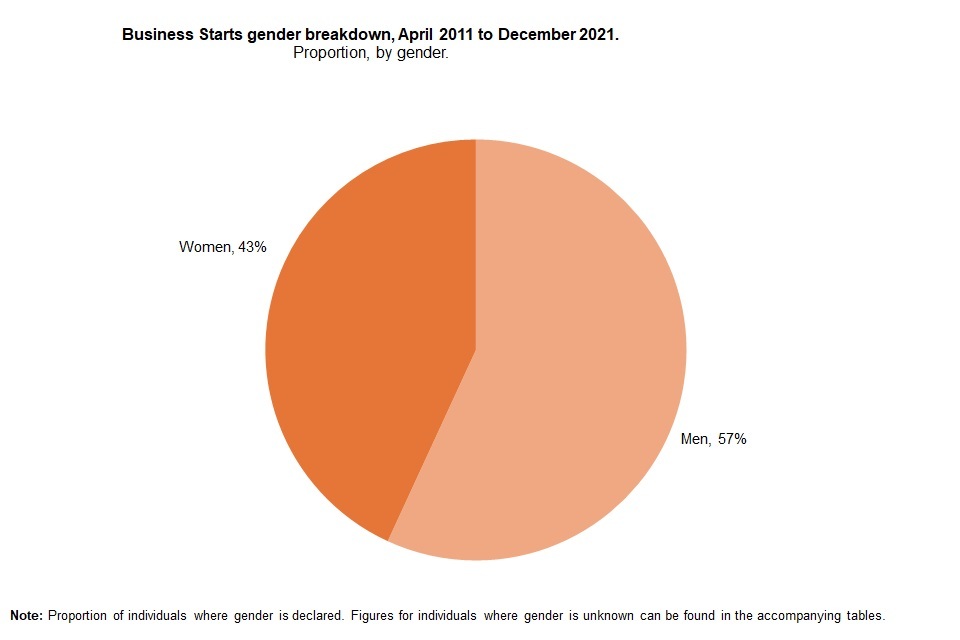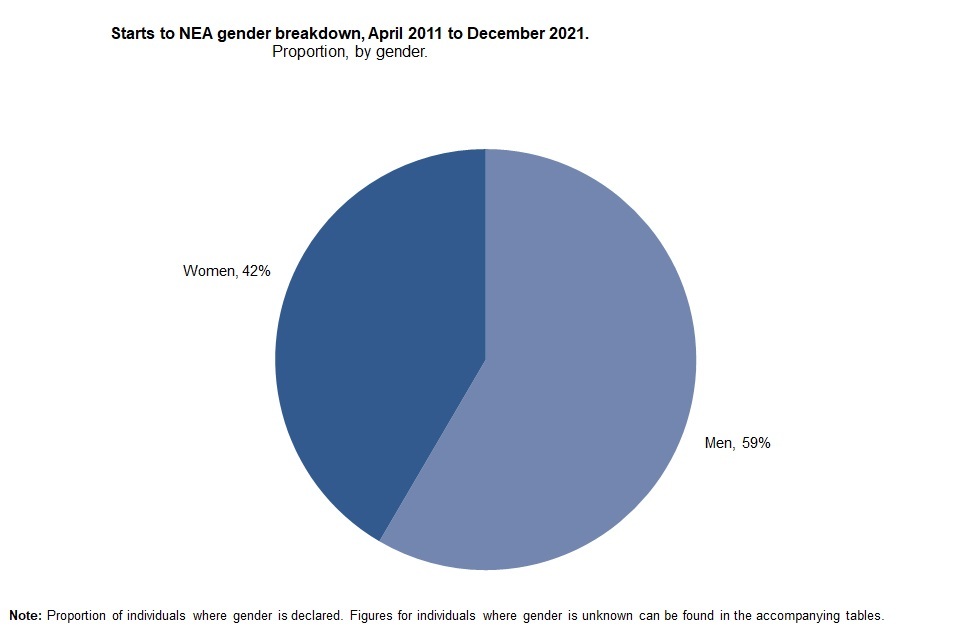 Out of the people who started on NEA, around 110,000 (42%) were women and 155,000 (59%) were men, of which around 65,000 and 86,000 respectively have progressed to set up a business respectively.