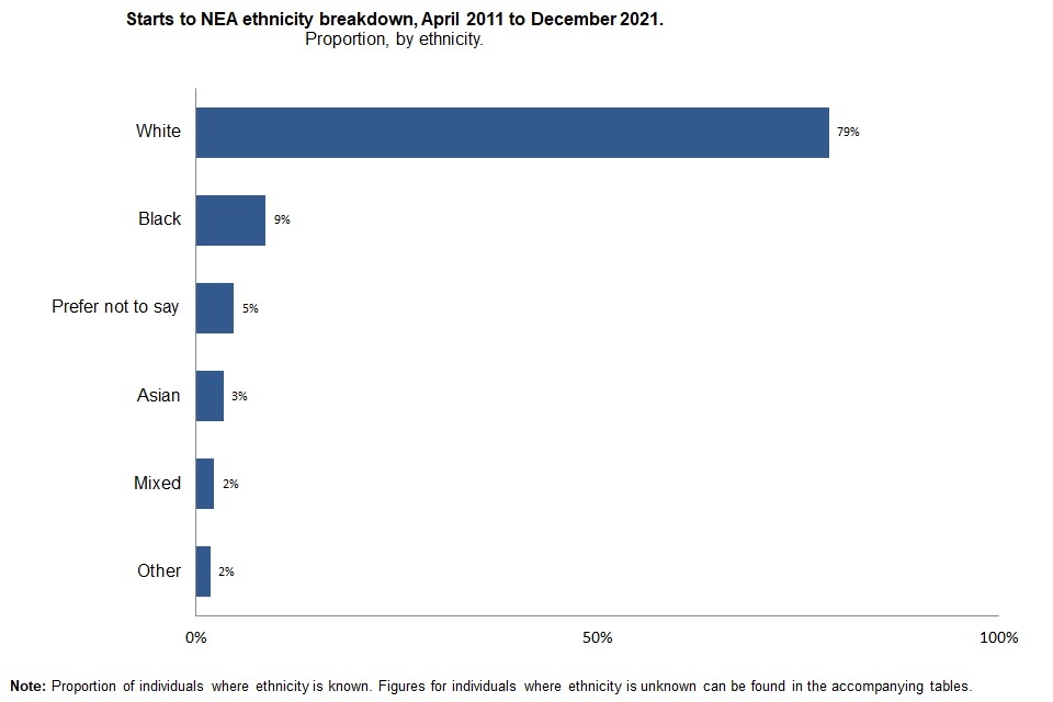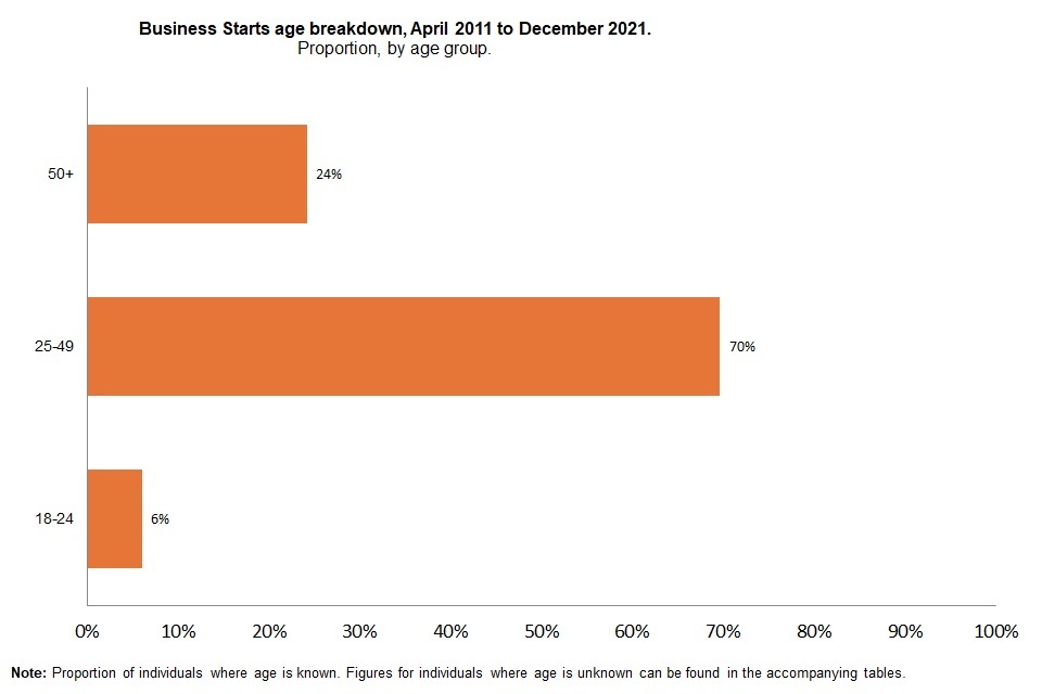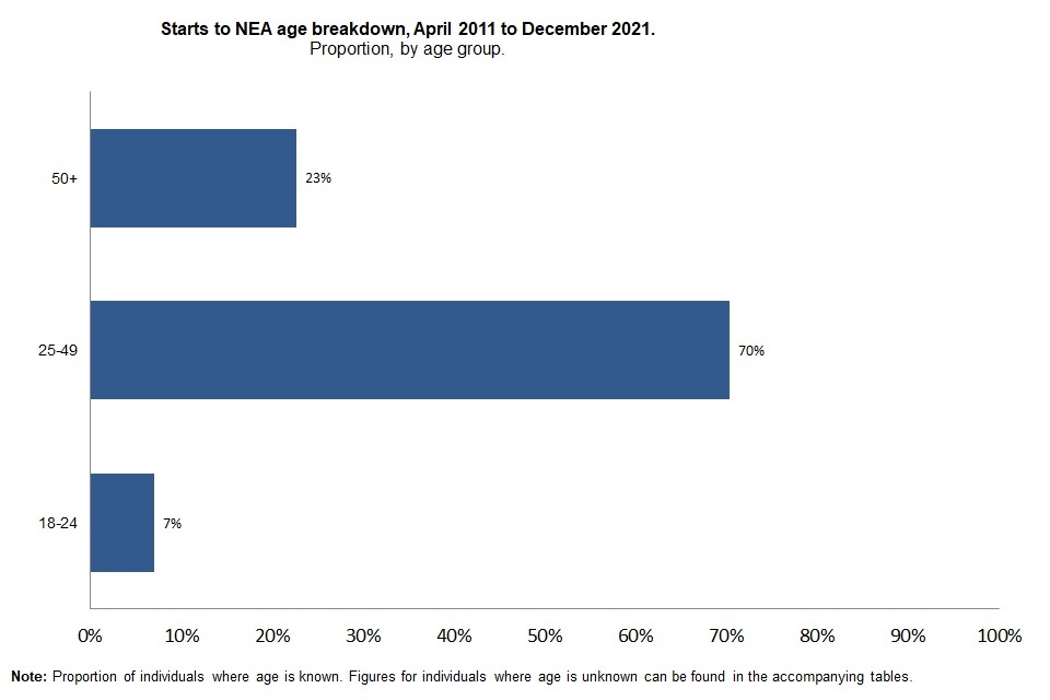 The majority (70%) of starts to NEA are aged 25-49, with around 185,000 individuals starting NEA in this age group. As of December 2021, 106,000 businesses were started from this age group.