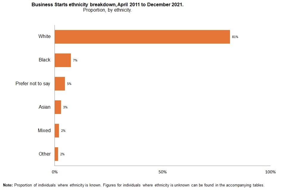 Of individuals whose ethnicity is known, around 205,000 (79%) of those who started the programme have identified as white, with a further 16% from ethnic minorities and 5% where ethnicity was not disclosed. As of December 2021, 121,000 businesses were started claimants identifying as ‘white’, 21,000 businesses were started by ethnic minorities, and 7,000 businesses were started where ethnicity was not disclosed.