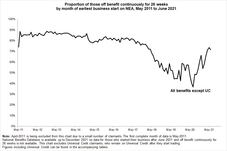 Overall, since the start of the programme, the average proportion of NEA participants who were off benefit for 26 weeks continuously following their business start was around 82%. This figure excludes Universal Credit claimants, who remain on Universal Credit after they start trading.