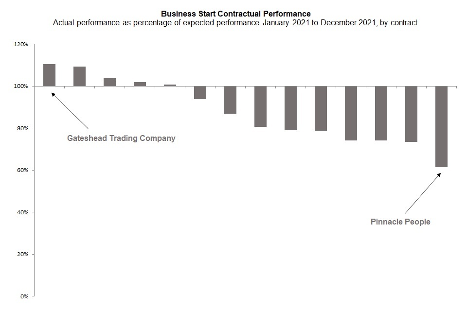For business starts, actual performance as a proportion of expected performance ranges from 61% for Pinnacle People to 110% for Gateshead Trading Company.
