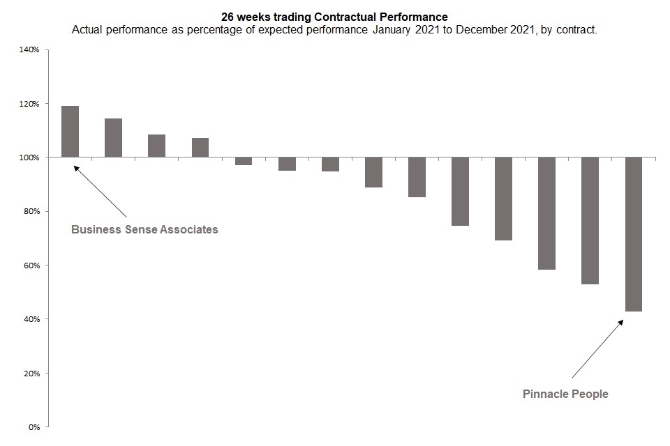 For 26 weeks trading, actual performance as a proportion of expected performance ranges from 43% for Pinnacle People to 119% for Business Sense Associates.