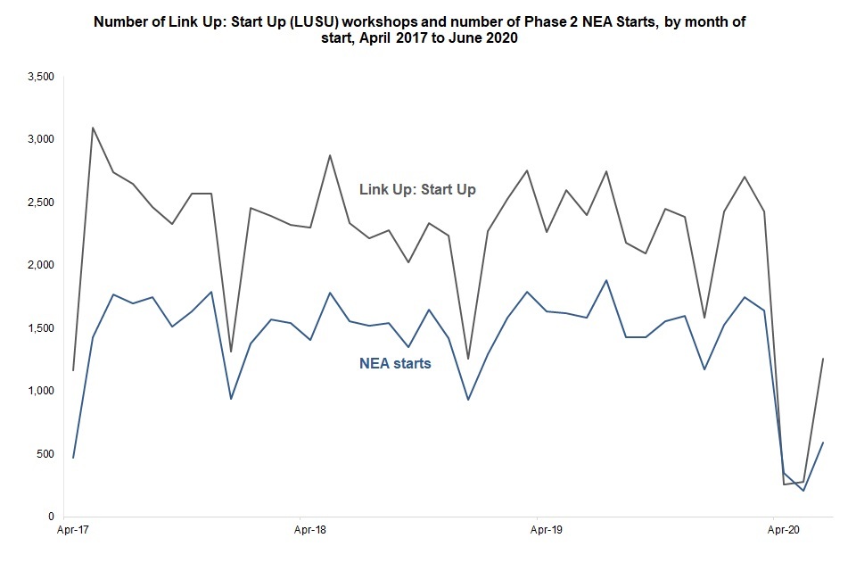 Phase 2 of the programme, introduced in April 2017, involves claimants attending a Link Up: Start Up (LUSU) Workshop before moving on to start to NEA. Previously, starts on a LUSU Workshop and starts to NEA were recorded separately. From 6 July 2020, the LUSU start was no longer recorded and so the charts below only reflect the period April 2017 to June 2020. Figures for LUSU starts up to 6 July 2020 can be found in the accompanying tables.