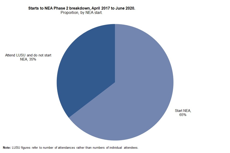 Over the period, April 2017 to June 2020, 65% of LUSU workshop attendances resulted in a start to NEA. This compares all starts to NEA, rather than tracking individuals.