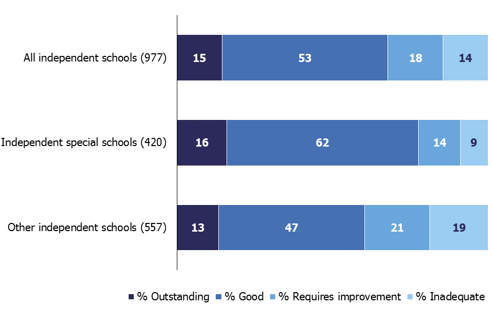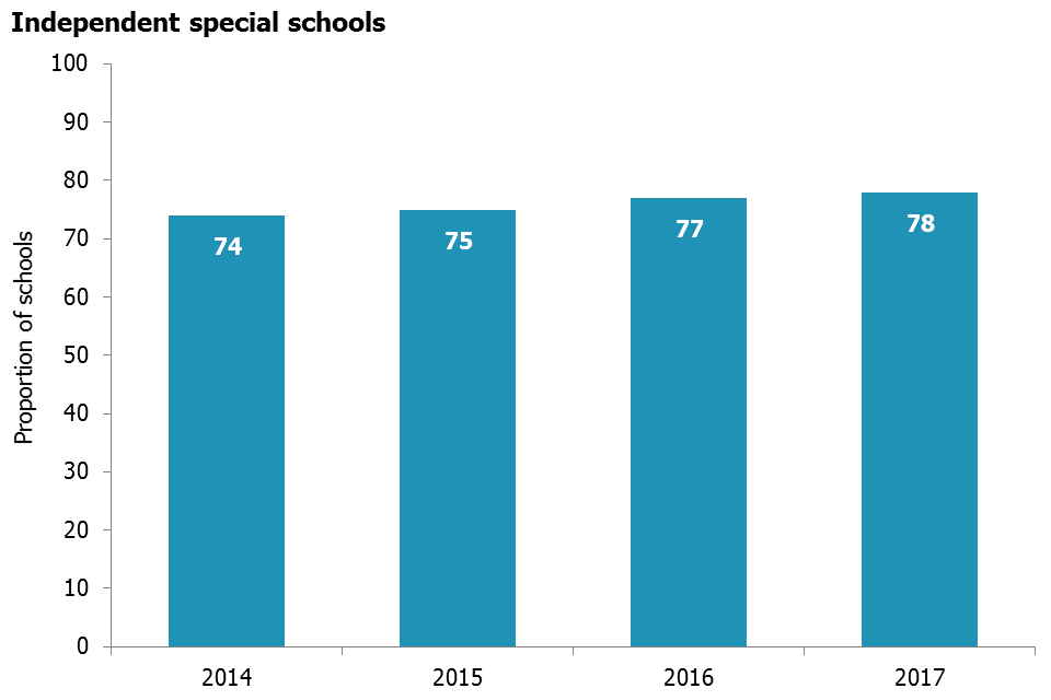 Seventy-eight per cent of special schools were judged good or outstanding compared with 60% of other independent schools. Only 9% of special schools were judged inadequate compared with 19% of other independent schools.