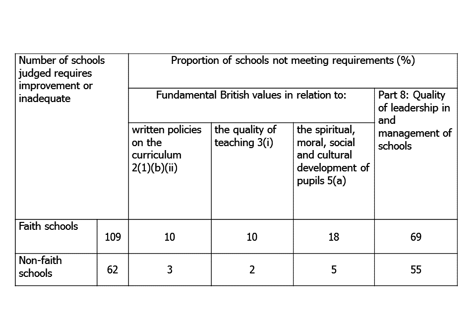 These standards included a new section on leadership and management (Part 8), but also included a focus on fundamental British values. The new standards on fundamental British values look at requirements in relation to written policies on the curriculum (requirement 2(1)(b)(ii)), the quality of teaching (requirement 3(i)) and the spiritual, moral, social and cultural development of pupils (requirement 5(a)). While numbers are small, a higher proportion of the weaker faith schools are failing on these requirements when compared to those with no faith (Table 2).