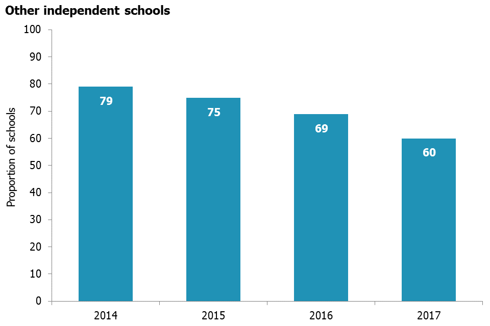 The proportion of special schools judged good or outstanding has improved over recent years, from 74% in 2014 to 78% in 2017. However, the decline in inspection outcomes for other independent schools over the same period has been quite stark. The proportion of these schools which are good or outstanding at their most recent inspection has fallen from 79% in 2014, to 60% in 2017.