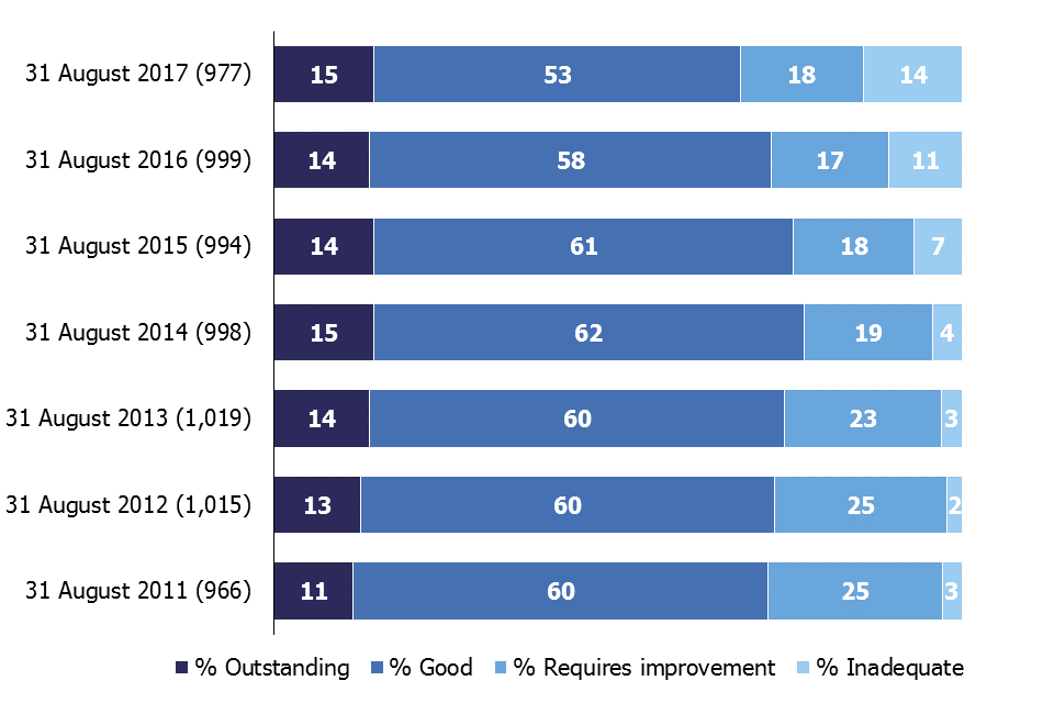At the end of August 2017, 68% of schools inspected were judged good or outstanding at their most recent inspection. This is 4 percentage points lower than the proportion judged good or outstanding as at 31 August 2016.