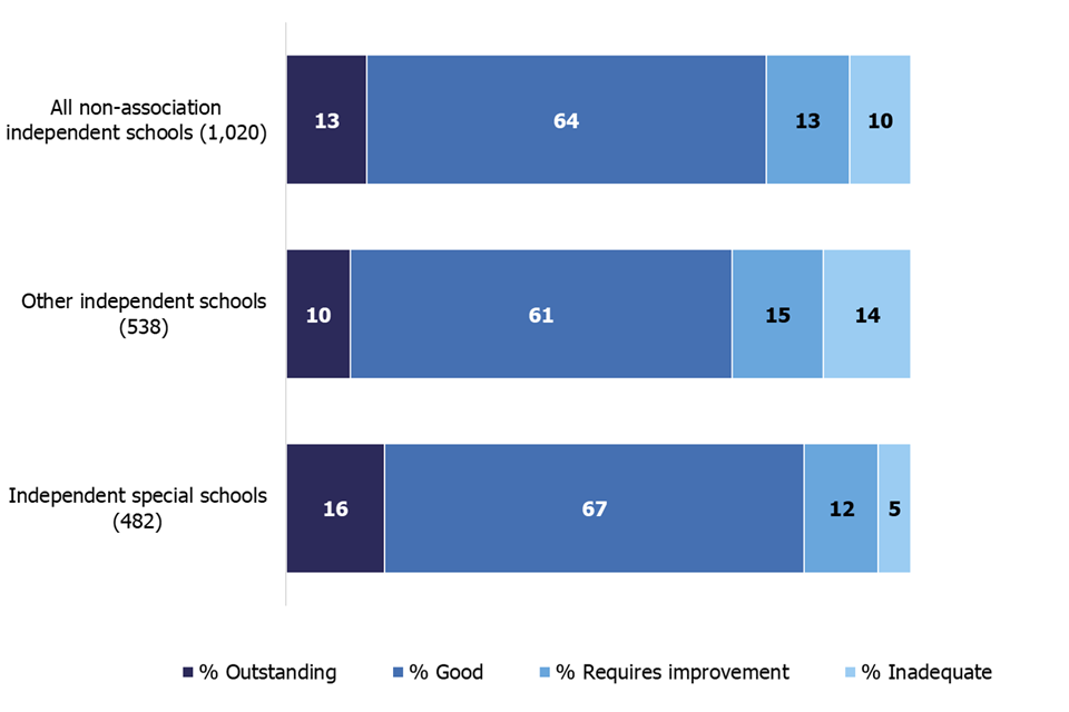 The outcomes for non-association independent schools have improved slightly, with 77% judged good or outstanding at their most recent standard inspection compared with 75% as at 31 August 2019. Thirteen per cent of schools are judged requires improvement and 10% inadequate.
