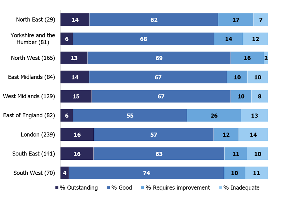 The regions with the highest proportion of schools judged good or outstanding were the North West and West Midlands (82%). The East of England had the lowest at 61%, this is a drop of 5 percentage points from 31 August 2019.