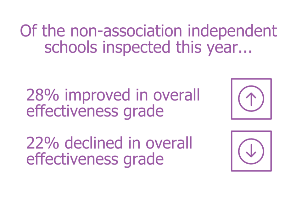 It is important to note that independent schools are inspected on a 3-year cycle. Weaker schools tend to be inspected earlier because we normally inspect schools that are judged requires improvement or inadequate within 2 years. The group of schools for which we are responsible for inspecting has also changed year to year. This means that inspection outcomes in any given year may not be representative of all non-association independent schools.