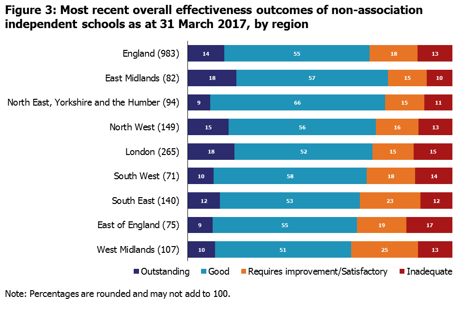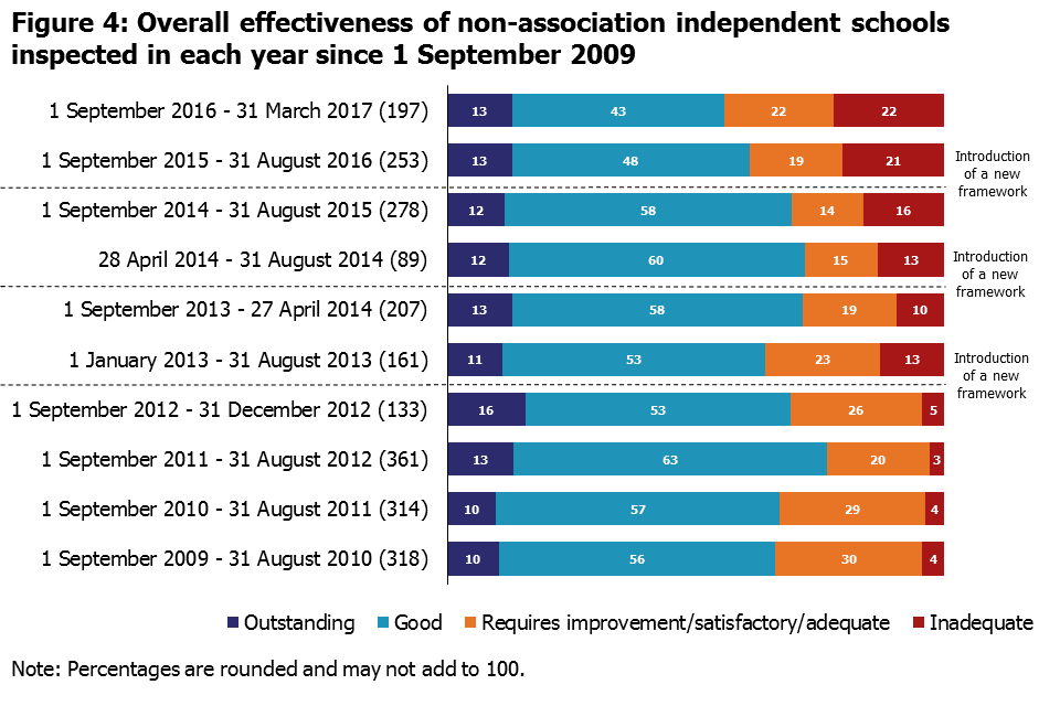 At the end of March 2017, 130 schools (13%) were judged inadequate at their most recent inspection. This continues the decline since August 2014, when only 43 schools (4%) were inadequate. This reflects the higher expectations of the new independent school standards, introduced by the Department for Education in September 2014 and supplemented in January 2015.