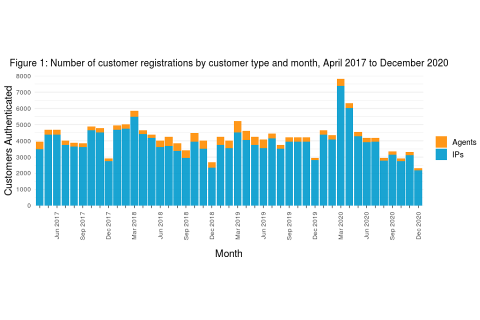 The number of interested persons (IPs) and agents registering for CCA each month is shown in Figure 1. More than 90% of registrations are from interested persons rather than agents. Increases seen in March and April 2020 is a spike attributable to the COVID-19 pandemic.