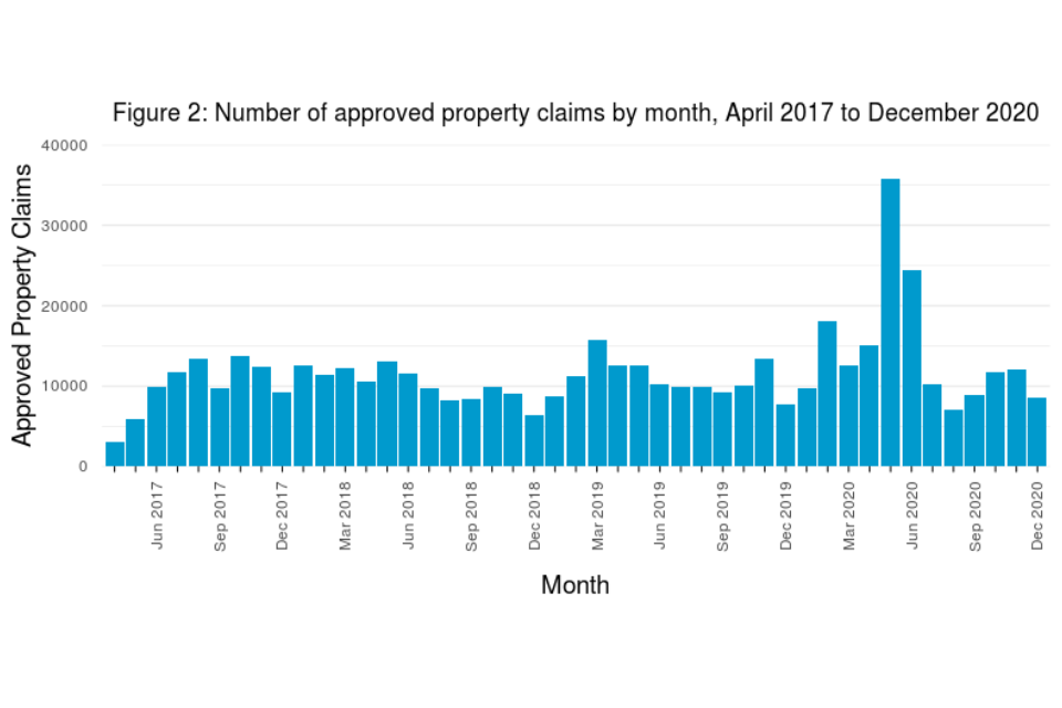 The number of approved property claims by month is shown in Figure 2. May and June 2020 are the months with the highest number of approved claims. The lag from the peak shown in Figure 1 reflects the time taken from a customer registering for CCA to then claiming a property and having their claim approved by a Valuation Officer.
