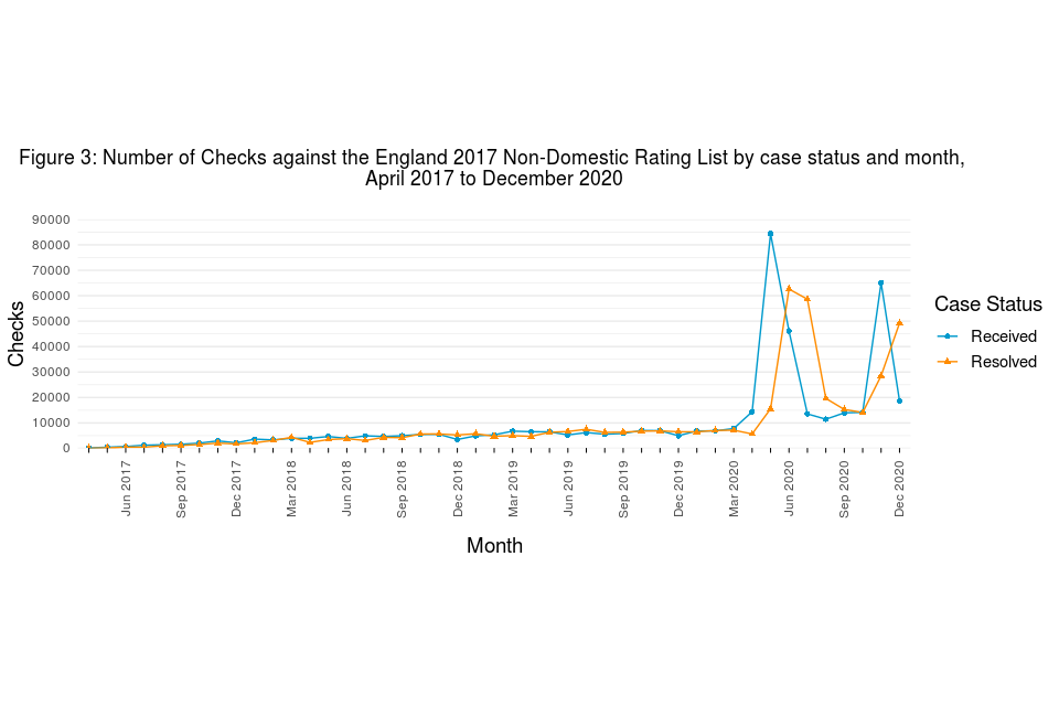 Figure 3 shows the number of CCA checks received by month and case status. The 97,850 checks received in the quarter to 31 December 2020 is 22% of the total received since the start of the list in April 2017. The two spikes are attributable to the COVID-19 pandemic and were coincident with government-imposed restrictions on business.