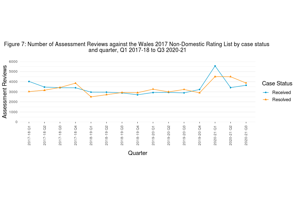 Figure 7 shows that the number of assessment reviews received against the Wales 2017 list increased in the quarter to 31 December 2020. Assessment reviews being resolved decreased slightly in the same period.