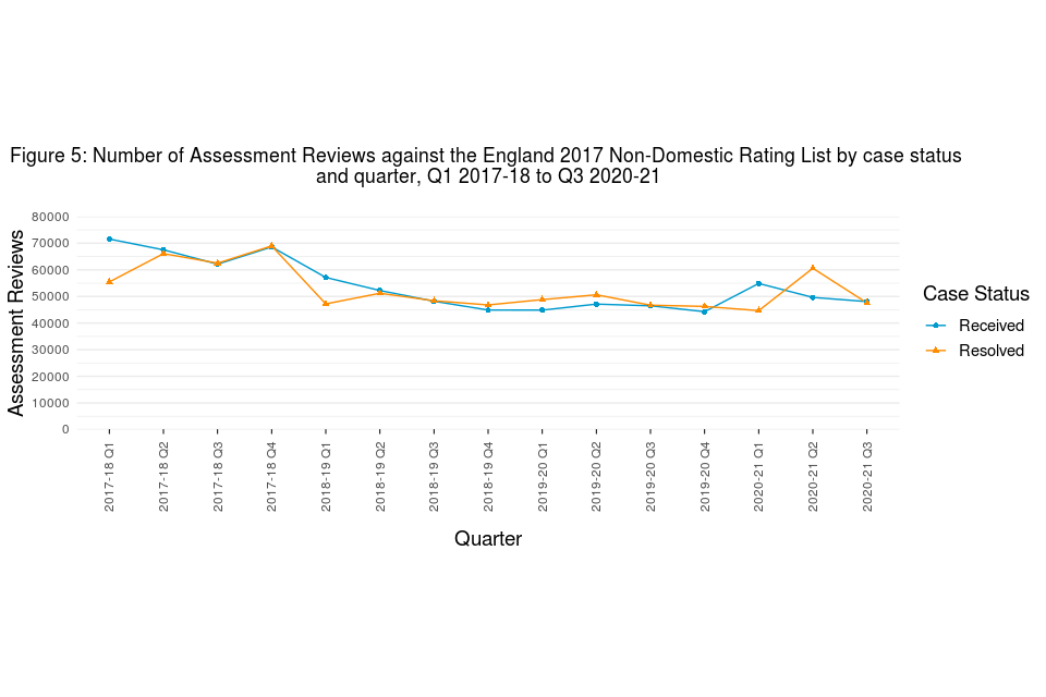 Figure 5 shows that the number of assessment reviews received and resolved against the England 2017 list had a slight decrease in the quarter to 31 December 2020.